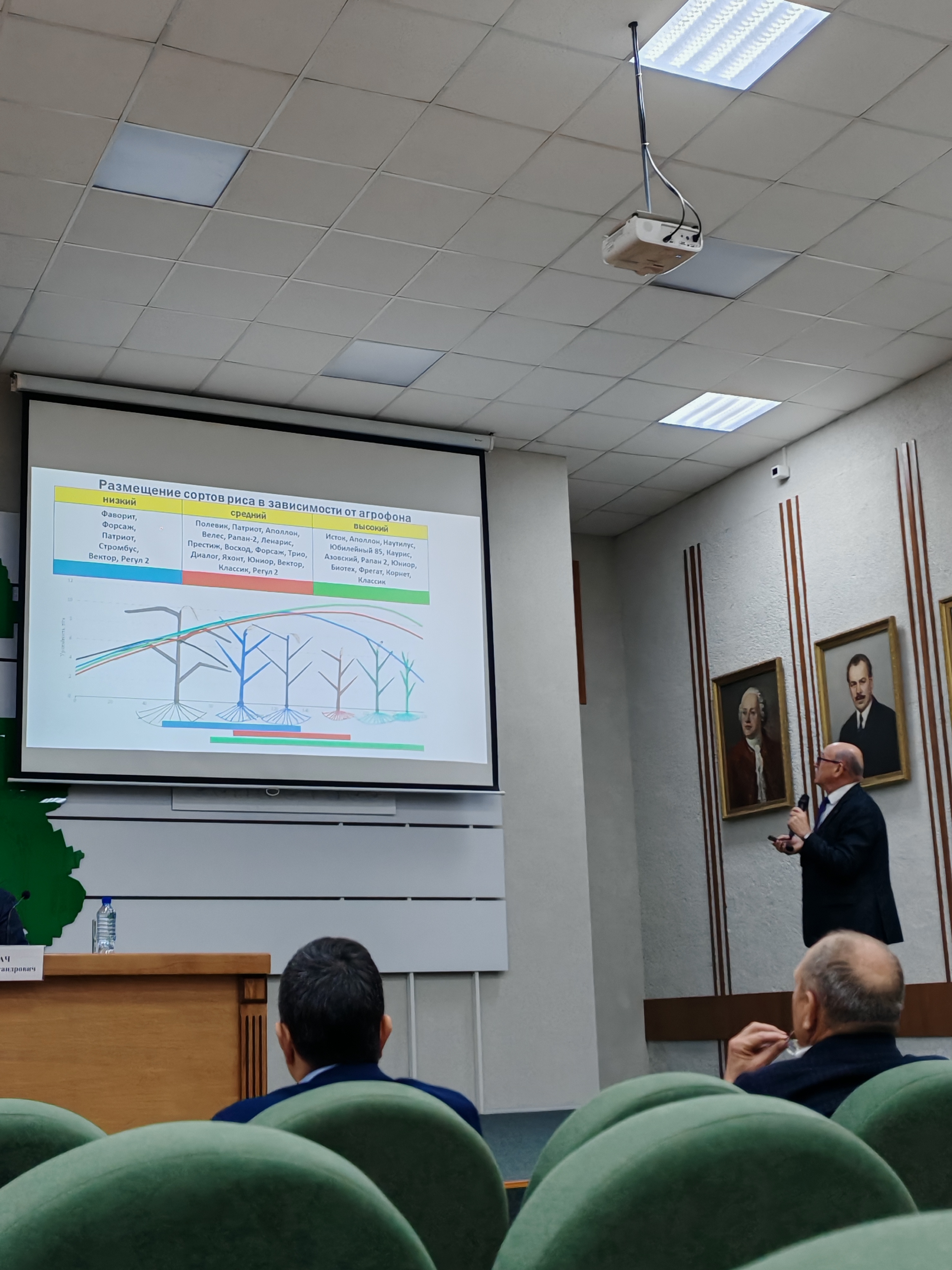 Главный научный сотрудник отдела селекции ФНЦ риса Виктор Ковалев рассказал об особенностях возделывания риса в этом году. Он напомнил о важности правильной подготовки почвы перед посевом, о качестве семян — необходимо сеять только семена с энергией прорастания не менее 85% и всхожестью не менее 95%. Виктор Савельевич рекомендовал хозяйствам размещать сорта в зависимости от уровня агрофона, а также использовать сортосмеси, которую дают большую урожайность.